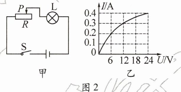 4. (2023·黑龙江)如图2甲所示的电路,电源电压保持不变,小灯泡L的额定电压为24 V。当将滑动变阻器R的滑片P移到最左端时,小灯泡L恰好正常发光。图2乙所示为通过小灯泡L的电流与其两端电压的关系图像。当小灯泡L正常发光时,其灯丝的电阻为