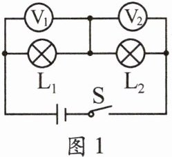 3. 实验室里有两个额定电压相同的小灯泡L₁、L₂,小华想知道哪个小灯泡的额定功率更大,于是将它们串联接入电路,如图1所示。闭合开关,两个小灯泡均发光,电压表V₁的示数比电压表V₂的示数小,此时实际功率更大的小灯泡是