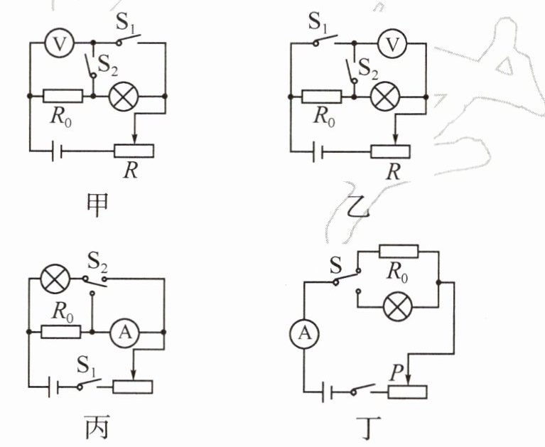 2. 已知一个小灯泡的额定电压,小明打算增加一个定值电阻R₀,只利用一只电表,通过操作开关来测量该小灯泡的额定功率。下列是小明设计的四种电路图,其中能够测出小灯泡额定功率的是 (