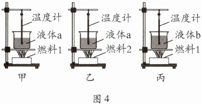 12. 如图4所示,甲、乙、丙三个装置完全相同,所用燃料的质量相等,三个烧杯内的液体质量和初温也相同。