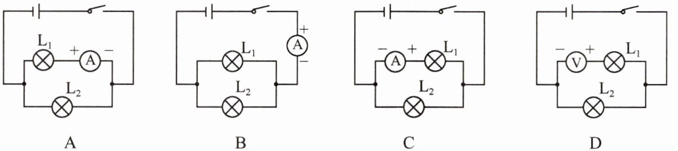 6.(2023•怀化)选项图中能够直接测出灯$L_1$电流的电路是(