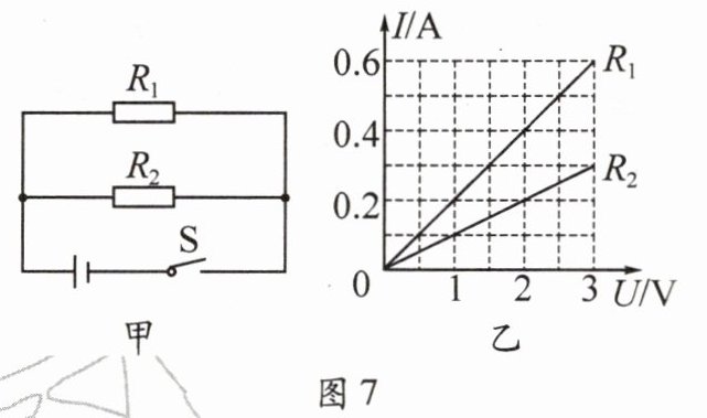 12. $R_{1}$、$R_{2}$两个定值电阻并联在电路中,甲所示,通过它们的电流与其两端电压的关系如图7乙所示。闭合开关S,则$R_{1}$、$R_{2}$产生的热量之比为 (