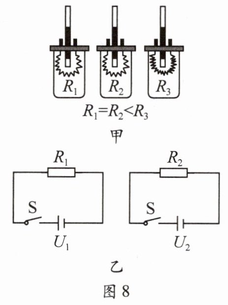将三个透明容器封闭,三根电热丝的电阻大小关系如图8甲所示。(1)如图8甲所示,电热丝放出热量的多少是通过