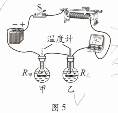 8. (2024·泰州)所示是某实验小组做“探究影响电流热效应的因素”实验的装置,其中甲、乙两个完全相同的烧瓶内装有等质量的同种液体,两根电阻丝分别浸没在两烧瓶的液体中且$R_{甲}≠R_{乙}$。有下列四个观点:①烧瓶内可以装入不同种类的液体;②温度计示数的变化可反映电阻丝产生热量的多少;③该装置能探究电流通过导体产生的热量与电阻的关系。在不增加其他器材和仪表的条件下,上述观点中正确的有 (