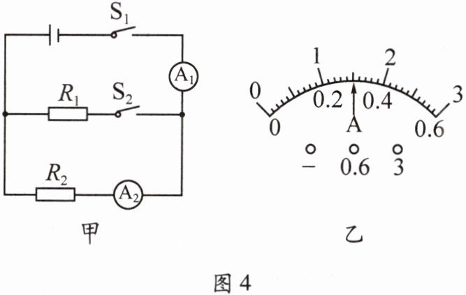 4. (2024·遂宁)甲所示的电路,先闭合开关$S_{1}$,再闭合开关$S_{2}$,电流表$A_{1}$的示数变大,此时两电流表的指针都指着刻度盘的中央,如图4乙所示,则通过$R_{1}$的电流为