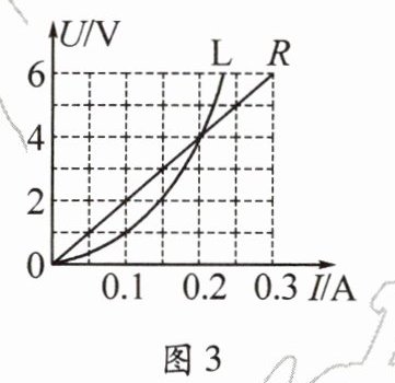 3. (2024·广元)所示是“扬帆”学习小组对小灯泡L和定值电阻R的阻值进行测量后,根据实验数据作出的$U-I$图像。若将L和R串联接在电压为8V的电源两端,L与R的电功率之比为