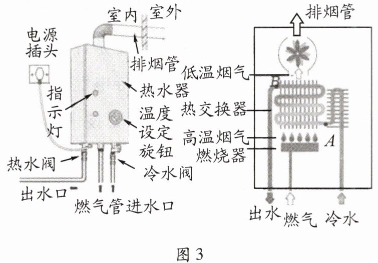 8. 图 3 所示为某款燃气热水器的结构和工作原理示意图。其基本的工作原理是:天然气燃烧产生高温给热交换器中的冷水加热。该燃气热水器的技术参数如表所列,“额定耗气量”的含义是:热水器正常工作1小时消耗的燃气体积。