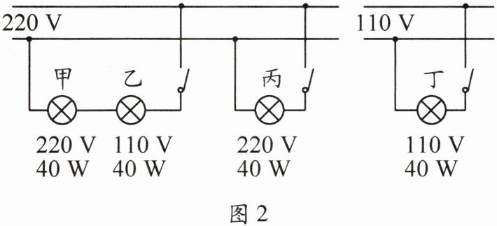 5. 如图2所示,接入电路的甲、乙、丙、丁四盏灯中,亮度最暗的是 (