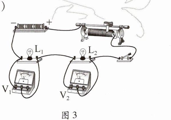 6. 实验室里有两个额定电压相同的小灯泡L₁、L₂。小华想知道哪个小灯泡的额定功率更大,于是将它们串联接入电路,如图3所示。闭合开关,L₁、L₂两个小灯泡均发光,电压表V₁的示数比电压表V₂的小,此时实际功率更大的小灯泡是