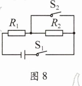 13. (2022·贵阳)如图8所示的电路,电源电压保持不变。只闭合开关S₁时,定值电阻R₁的功率是16 W;当开关S₁、S₂都闭合时,R₁的功率是25 W。由此可得,电路先后两次消耗的功率之比是