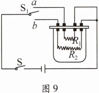 14. (2023·成都)小强利用家庭实验室中的器材,设计了一个可调节功率的简易“电饭锅”,如图9所示。其中,电源电压为6 V,电阻丝R₁=5 Ω,R₂=15 Ω,a、b是两个触点。闭合开关S,当开关S₁接通触点