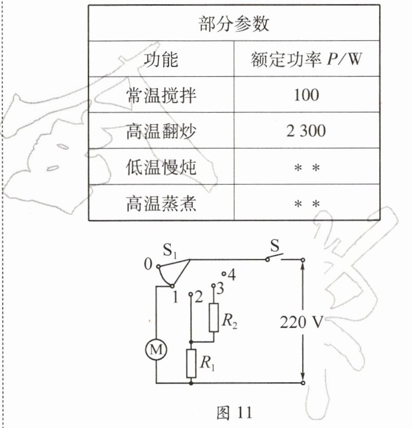 16. (2024·威海)小明家有一款多功能厨房“神器”,它的内部结构主要由两个电热丝和一个电动机构成,通过旋转开关可实现常温搅拌、高温翻炒、低温慢炖、高温蒸煮(电动机可实现搅拌、翻炒功能)。其参数如表所示,其内部电路简图如图11所示,其中R₂的阻值为66 Ω。