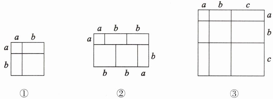 1. 对于一个平面图形,通过两种不同的方法计算它的面积,可以得到一个关于整式乘法的数学等式.例如,图①可以得到完全平方公式$(a + b)^2 = a^2 + 2ab + b^2$.请利用这一方法解决下列问题: