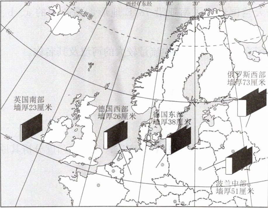 (1)英国南部至俄罗斯西部,传统民居墙壁的厚度逐渐____。