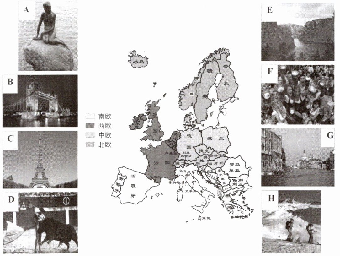 1. A−丹麦;B−英国;C−法国;D−西班牙;E−挪威;F−德国;G−意大利;H−瑞士。