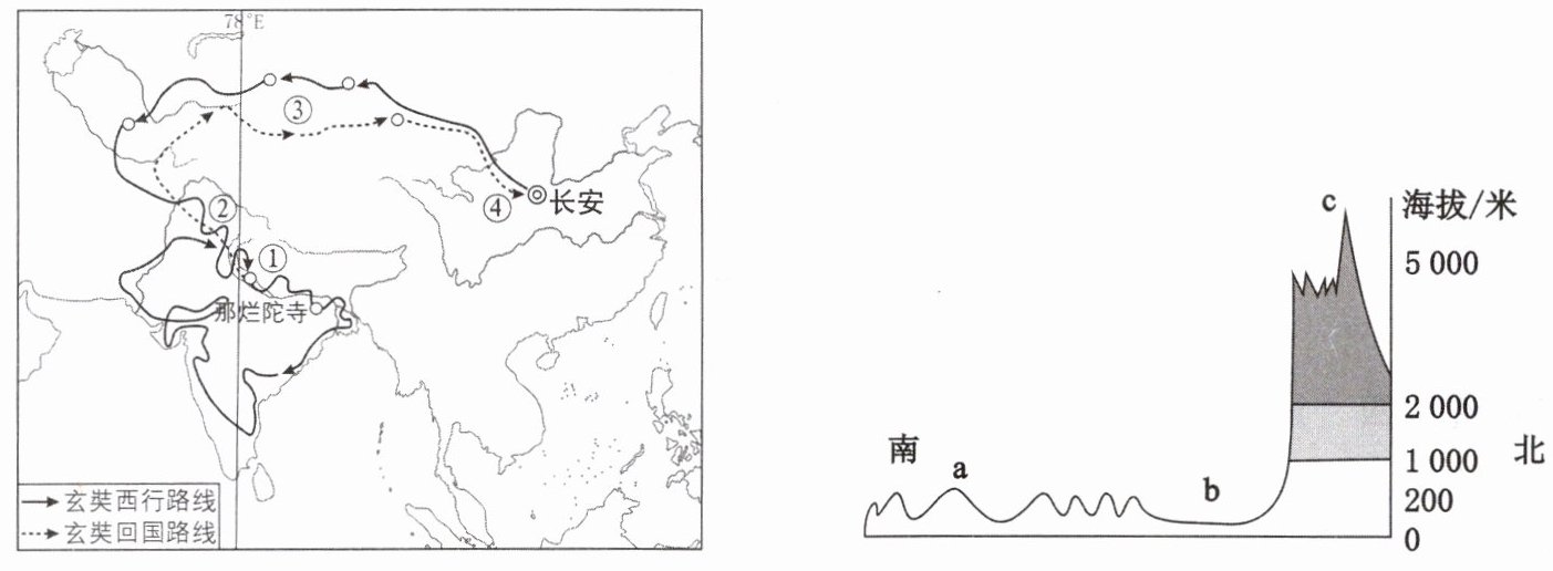 1. 玄奘西行去天竺国经过了南亚沿 78°E 地形剖面图中的 a、b、c 中的