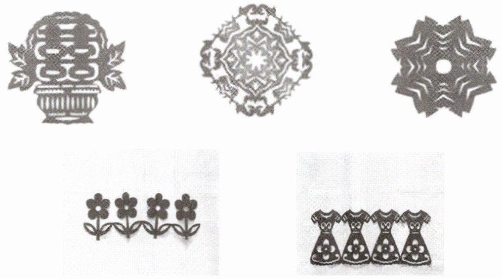 1. 剪纸艺术是最古老的中国民间艺术之一,作为一种镂空艺术,在视觉上它给人以透空的感觉和艺术的享受. 剪纸是用剪刀将纸剪成各种各样的图案,如窗花、门笺、墙花、顶棚花等. 每逢过节或新婚喜庆时,人们便将美丽鲜艳的剪纸贴在家中窗户、墙壁、门和灯笼上,节日的气氛也因此被烘托得更加浓烈. 下面是一些剪纸图案,它们有什么相同点? 请你试着找几个也具有相同特点的剪纸图案,将它们贴在下面的空白处. 有兴趣的同学可以尝试自己动手剪一剪.