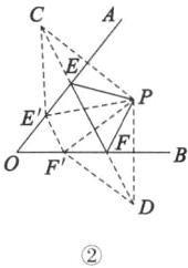 (2)存在. 如图②,作点P关于OA的对称点C,关于OB的对称点D,连接CD,交OA于点E,交OB于点F,则点E,F就是所要求作的点.