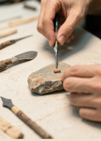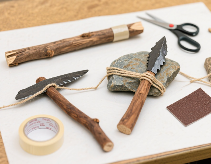 请同学们结合自己身边的材料,甄选制作用具,制作人类进化过程中的工具模型,并将制作过程用到的材料、制作过程和作品逐一拍摄下来,贴在下面的记录栏内。