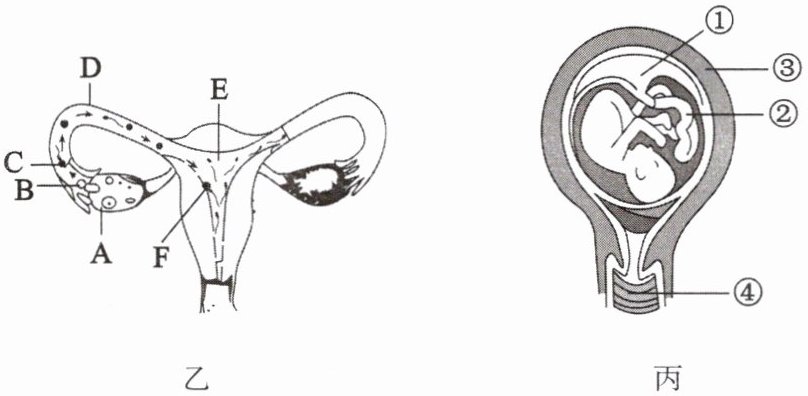 。(2)受精卵分裂后形成的胚泡最后附着在图乙的[F]