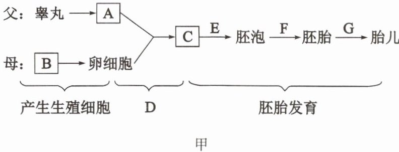 11. 母亲十月怀胎,历经辛苦抚育我们成长。对于母亲,用千言万语也无法表达我们的感激之情。图甲是某生物兴趣小组整理的人类生殖发育过程流程图,图乙是女性生殖系统示意图,图丙是胚胎在子宫内的发育示意图,请回答: