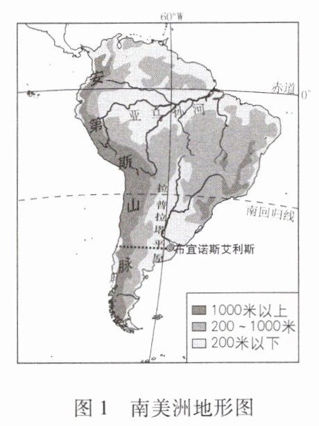某中学地理兴趣小组根据搜集的南美洲地形图(图1)、南美洲气候类型分布图(图2)、南美洲人口分布示意图(图3),运用区域地理学习的方法,探究南美洲的地理位置和地理特征。请帮助该小组完成相关探究任务。