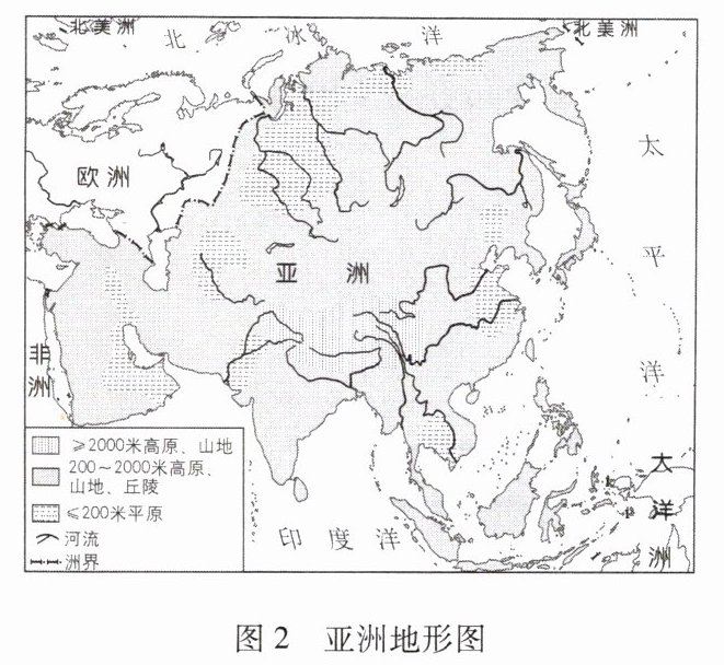 。2. 亚洲地形类型多种多样,地势中间高,四周低。