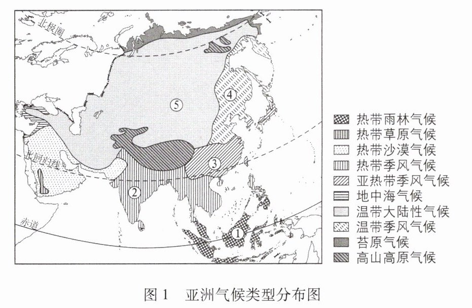 1. 概括亚洲气候的主要特征,并指出①地、④地所属气候类型。