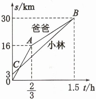 1. 周末小林和爸爸到汾河景区滨河绿道骑自行车。两人从绿道同一地点出发,小林先骑3km,从爸爸去追赶小林时开始计时,在超过小林后,发现小林没有跟来,就减速骑行,结果两人同时到达目的地。小林和爸爸离出发点的距离s(km)与骑行时间t(h)之间的关系如图所示。根据图象解答下列问题: