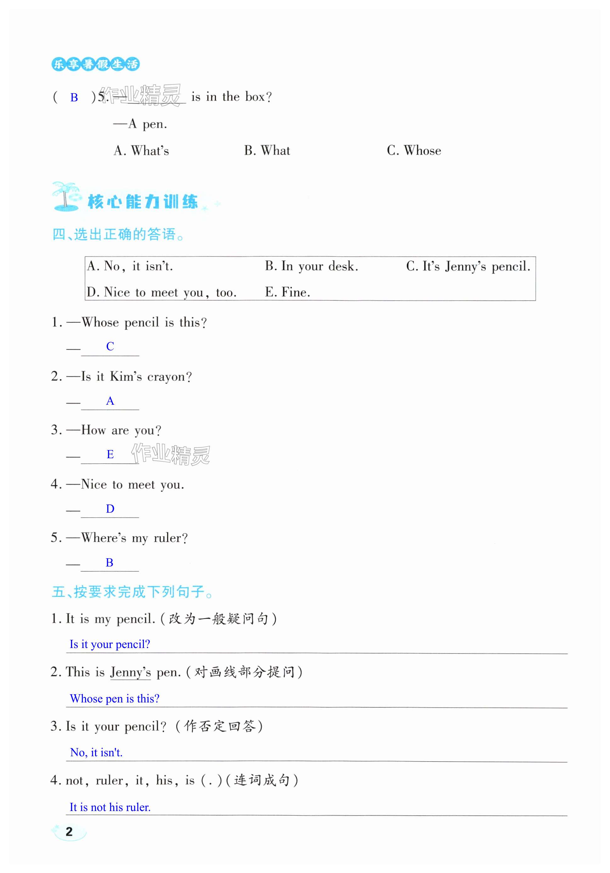 注:目前有些书本章节名称可能整理的还不是很完善,但都是按照顺序排列的,请同学们按照顺序仔细查找。练习册 2025年乐享暑假生活四年级英语冀教版 答案主要是用来给同学们做完题方便对答案用的,请勿直接抄袭。