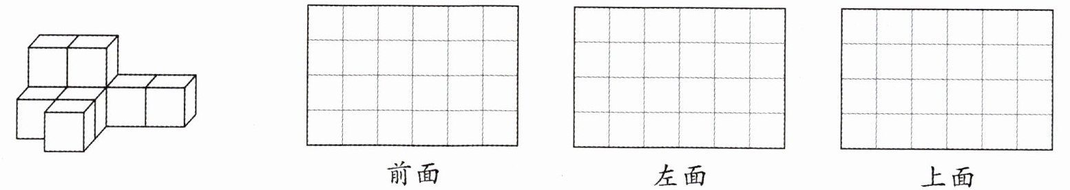 三 下面的几何体从前面、左面、上面看到的图形分别是什么?请你在方格纸上画出来。
