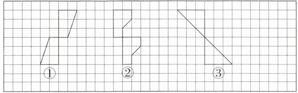 1.图形①的上半部分先向左平移3格,再向下平移3格,得到一个正方形;图形②的下半部分先绕中心点逆时针旋转180°,再向右平移2格,得到一个正方形;图形③的上半部分先向右平移3格,再向下平移3格,得到一个正方形。(答案不唯一) 2.图形①可以变成平行四边形,图形③也可以变成平行四边形。(答案不唯一)