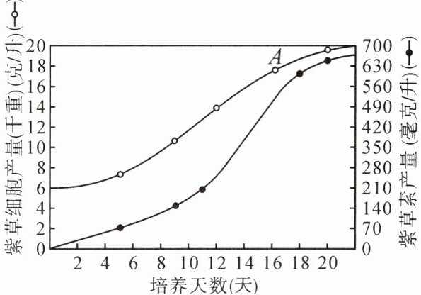 下图是发酵罐中紫草细胞产量、紫草素产量随培养时间发生变化的曲线。