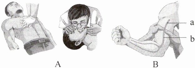 ;图B表示救护者采取指压止血法急救,由此判断伤口在b