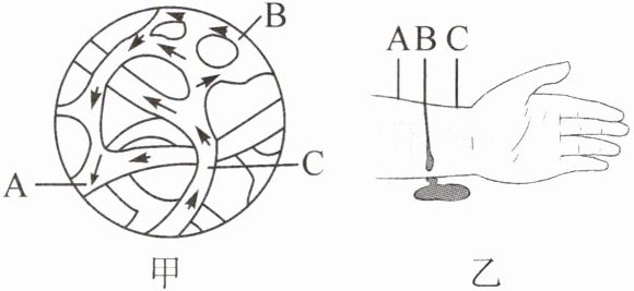 (2)遇到外伤出血的患者,需要及时止血。图乙所示受伤部位B有血液缓缓流出,按压止血的部位应该是图中的