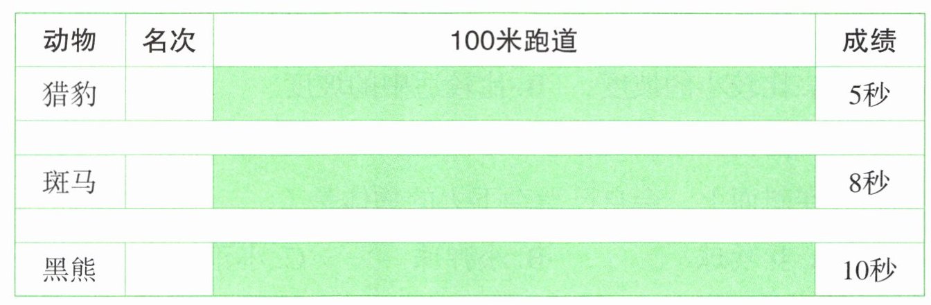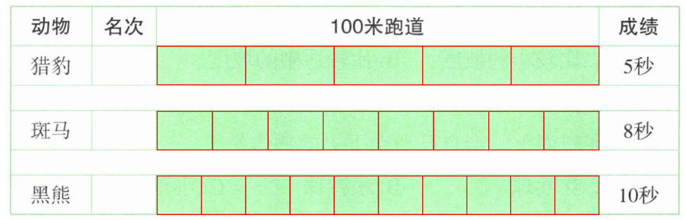 观察下页表中动物奔跑100米需要的时间,其中猎豹需要5秒,将表中猎豹的跑道想办法分成均等的5份。斑马和黑熊,则分别分成8等份和10等份。