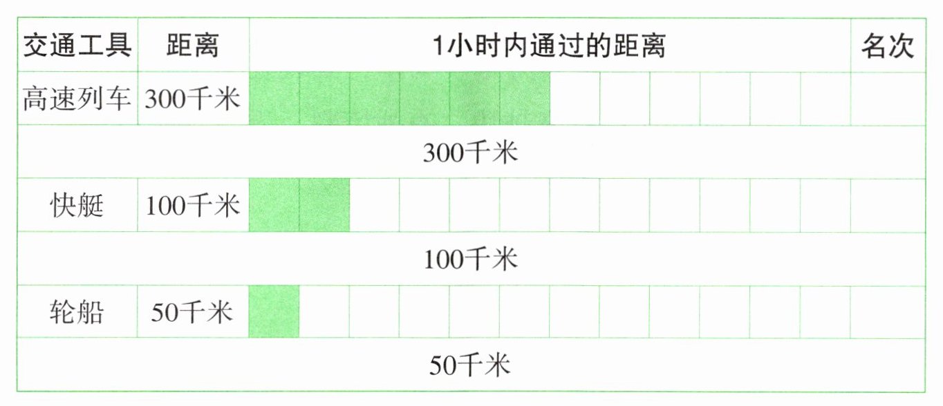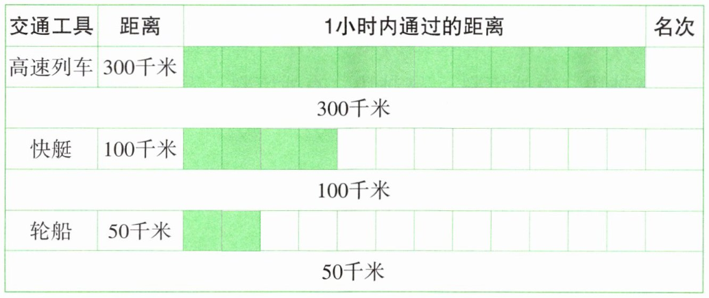 因为$50$千米$<100$千米$<300$千米,所以第一名是(高速列车),第二名是(快艇),第三名是(轮船)。