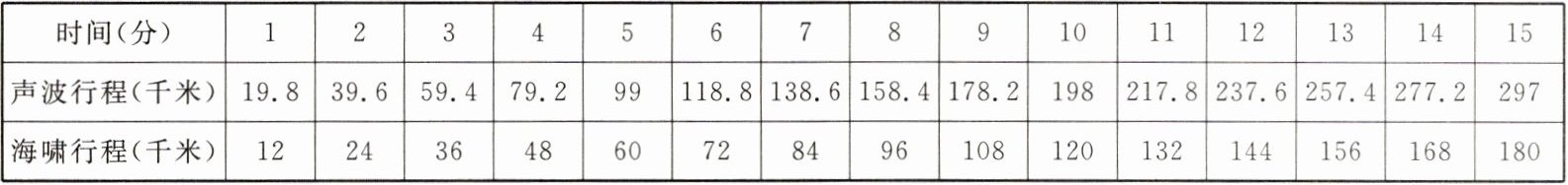 2. 当海啸暴发后,海啸声波与海啸在15分钟内的传播情况如下表.
