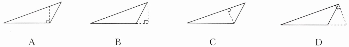 9. 小华在电话中问小明:“已知一个三角形三边长分别是4,9,12,如何求这个三角形的面积?”小明提示说:“可通过作最长边上的高来求解.”小华根据小明的提示作出的图形正确的是 (