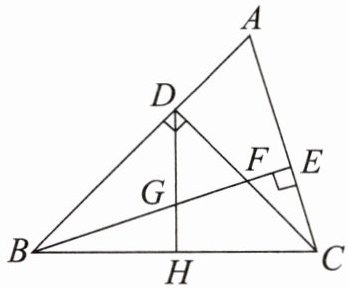 因为$BE\perp AC$,$CD\perp AB$,所以$\angle BDF=\angle ADC = 90^{\circ}$,$\angle ABE+\angle A=\angle ACD+\angle A = 90^{\circ}$,则$\angle ABE=\angle ACD$。