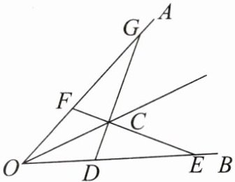 如果根据角平分线的判定方法,需要证明点C到∠AOB两边的距离相等,距离相等可以通过全等或面积相等证得.过C分别作OA,OB的垂线段CM,CN.先证得△OEF≌△OGD,那么△OEF与△ODG的面积相等,去掉公共部分,则△CDE与△CFG的面积相等(这里不必证△CDE≌△CFG).由题意,DE= FG,从而CM= CN,所以OC平分∠AOB.