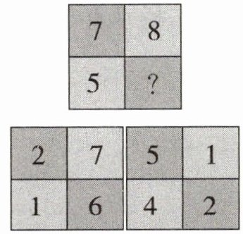 【解析】:观察下面两个完整的表格,发现规律是:同一表格中,左上角数字 + 右下角数字 = 右上角数字 + 左下角数字。