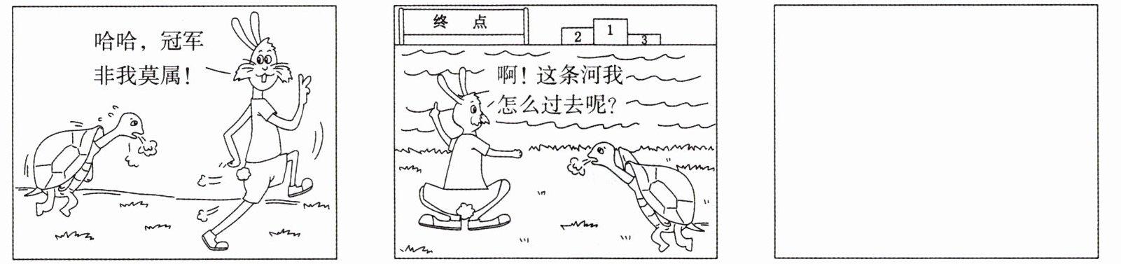 三、阅读漫画《龟兔赛跑新传》。试着续编故事的结尾,并用绘画的形式表示出来。