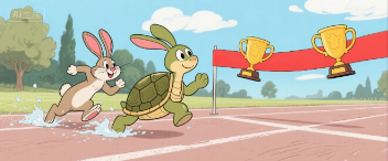 乌龟看到兔子着急的样子,停下脚步说:“兔子,你忘了我会游泳吗?我背你过去吧!”兔子不好意思地点点头。乌龟驮着兔子游到了对岸,兔子对乌龟说:“谢谢你,我们一起冲向终点!”最后,它们肩并肩地冲过了终点线,并列成为冠军。