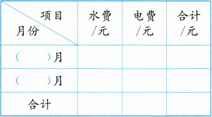 【答案】:假设调查的是7月和8月(月份可根据实际调查情况填写)。7月水费[X1]元、电费[Y1]元,合计[X1 + Y1]元;8月水费[X2]元、电费[Y2]元,合计[X2 + Y2]元;合计水费[X1 + X2]元、电费[Y1 + Y2]元、总合计[X1 + Y1+ X2 + Y2]元。感受:通过记录发现[具体情况,如8月电费比7月高,可能是因为8月天气更热,空调使用更频繁,以后可以注意合理设置空调温度等节约用电]。(以上数据中的[X1]、[Y1]、[X2]、[Y2]需根据实际调查填写)。