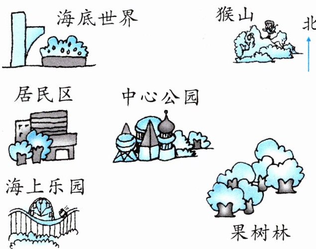 (1)海底世界、海上乐园、居民区、果树林分别在中心公园的什么方向?
