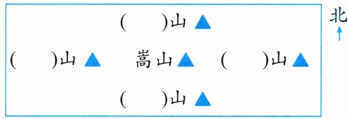 3. 我国的五座名山合称“五岳”,它们分别是中岳(),东岳(),北岳(),南岳(),西岳(),请补全它们的位置示意图。