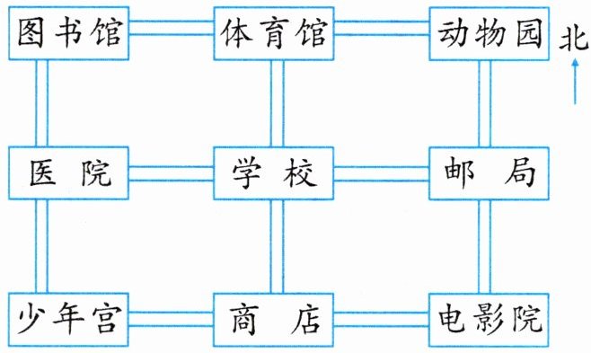 (2)图书馆、少年宫、电影院分别在学校的什么方向?