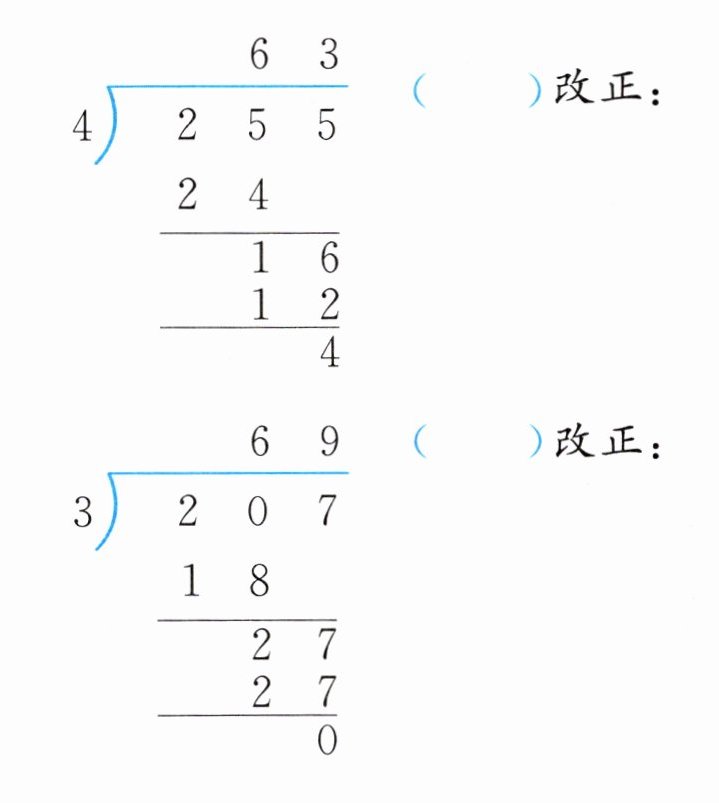 所以$255÷4 = 63\cdots\cdots3$,原计算中$15$除以$4$时,十位上余$1$,应和个位$5$组成$15$再除,而不是$16$。