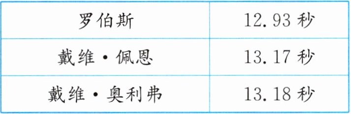 【解析】:在110米栏比赛中,用时短的人跑得快。比较三人成绩$12.93$秒、$13.17$秒、$13.18$秒的大小,先比较整数部分,都是$13$和$12$,因为$12\lt13$,所以$12.93$最小;再比较$13.17$和$13.18$,整数部分相同,比较十分位也相同,再比较百分位,$7\lt8$,所以$13.17\lt13.18$。$12.93$读作十二点九三,$13.17$读作十三点一七。